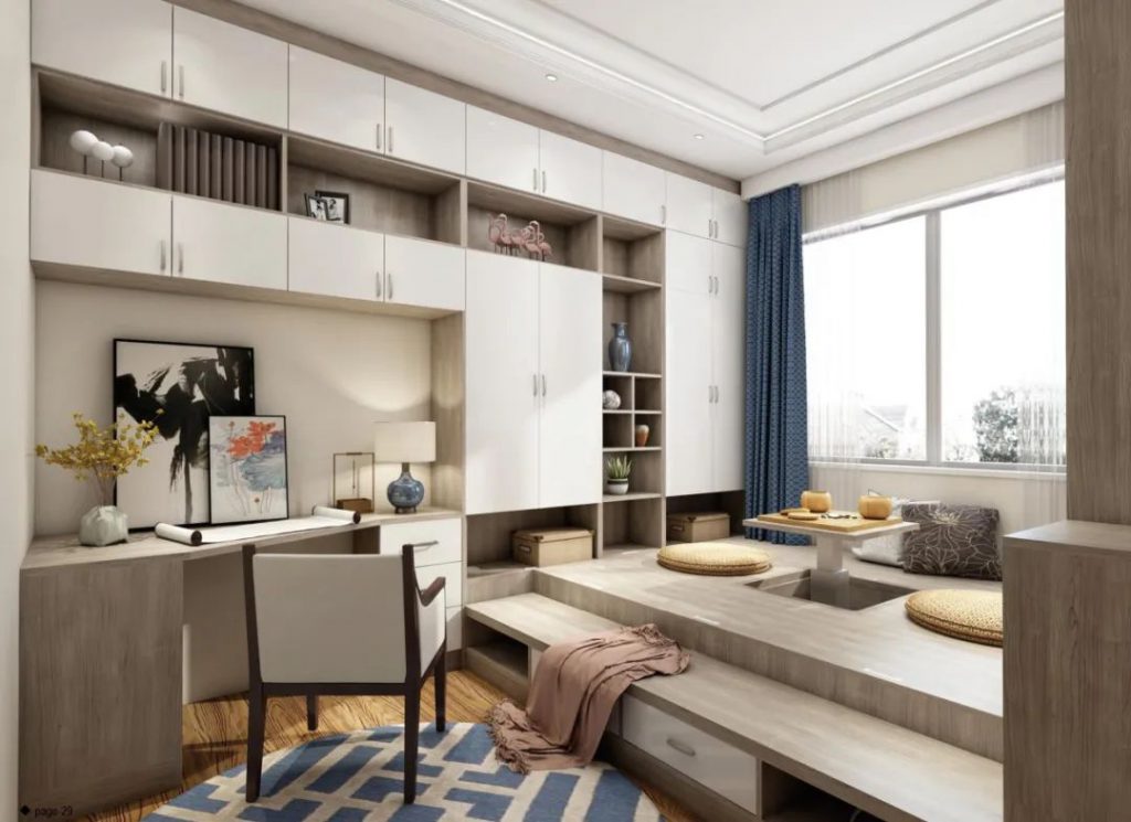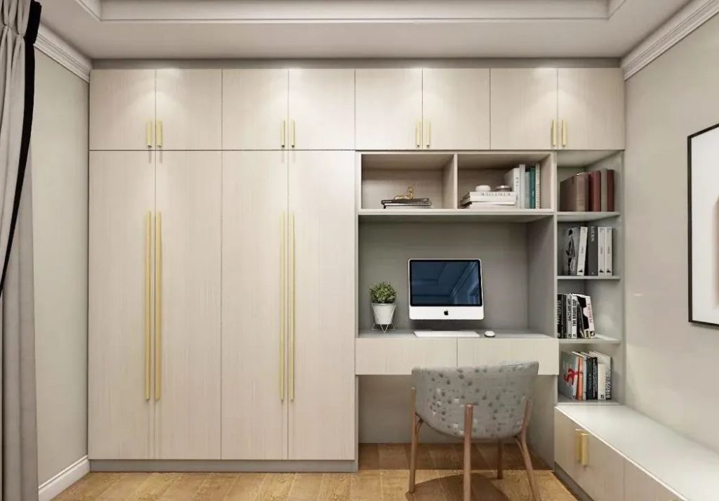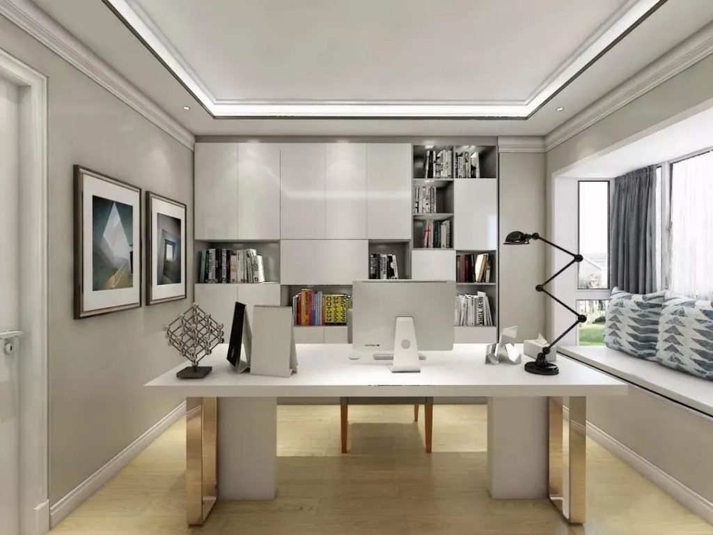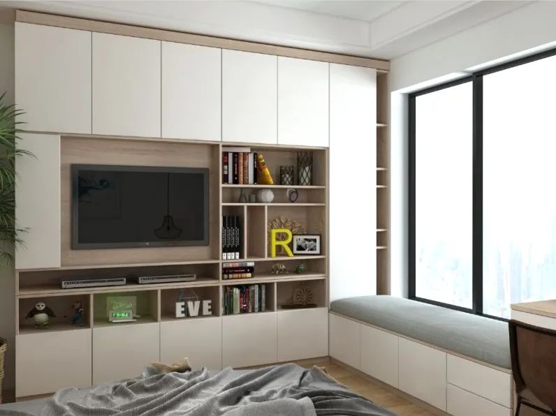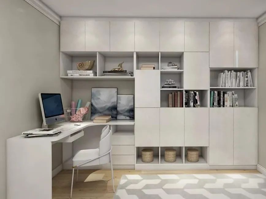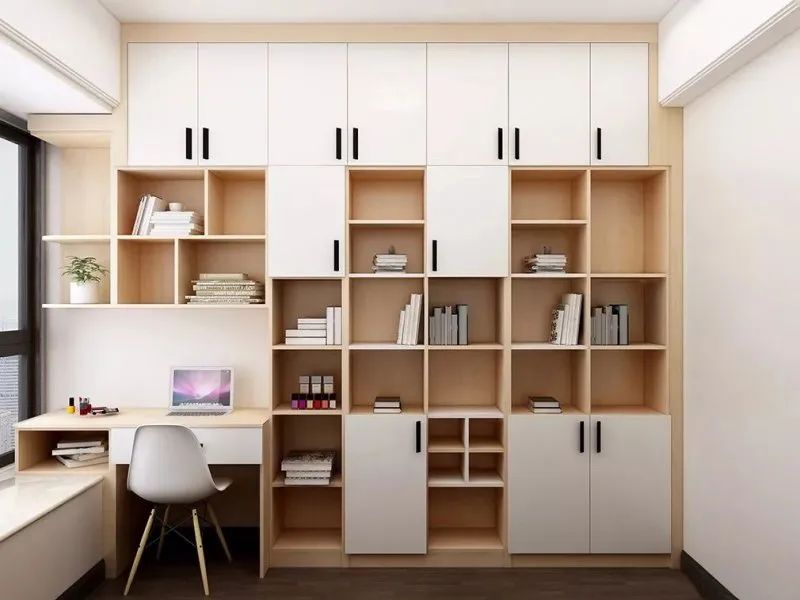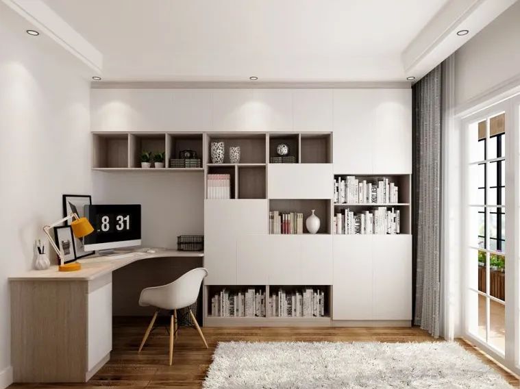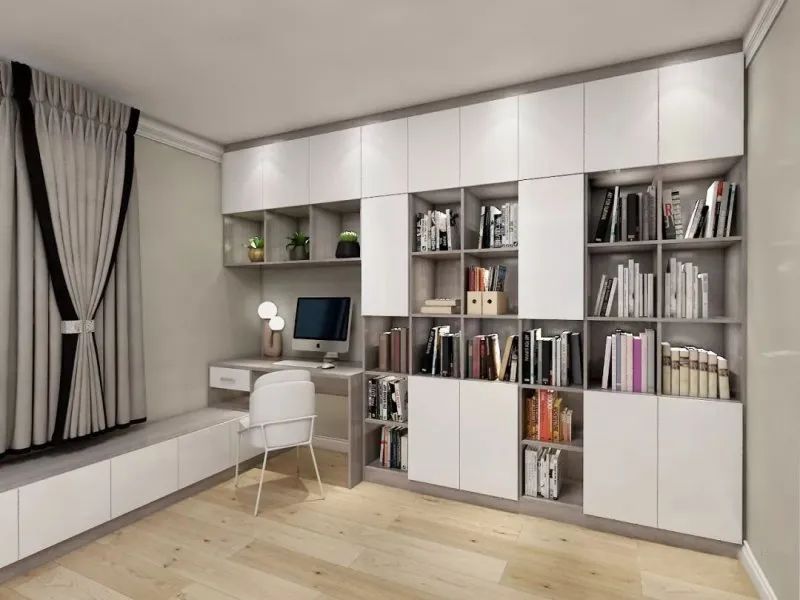 飄窗柜也可以做成簡(jiǎn)單的卡座、收納,和書(shū)桌融為一體,整空間的柜子顯得整體感很強(qiáng),很有品位。