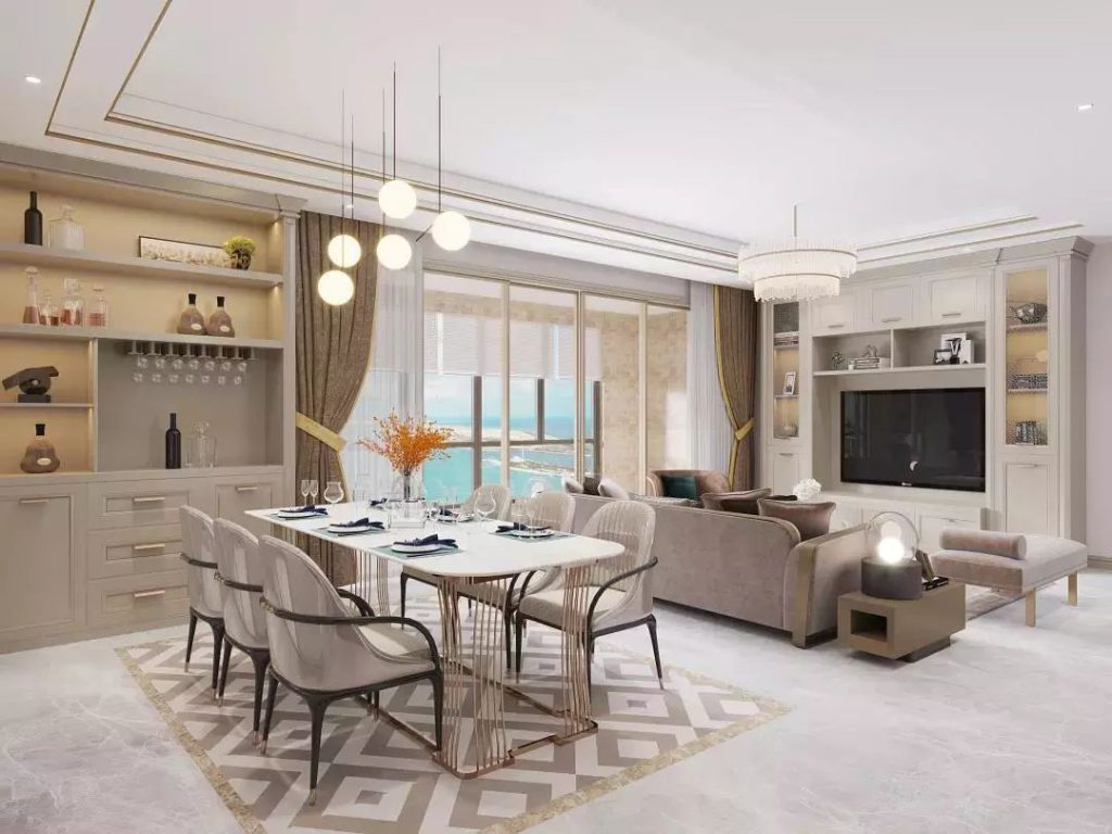 開放式設(shè)計的餐廳,使空間感十分開闊,在這樣寬敞的空間下用餐,不缺輕松、自然。配合極簡的吊燈,燈光柔柔地打在晶瑩的餐桌與玻璃餐具上,優(yōu)雅與時尚浪漫氣息油然而生。在餐廳當(dāng)中加上了金屬元素,吊燈和餐椅都顯得格外的精致,白色大理石桌面和黑色桌腳的設(shè)計,也是現(xiàn)代空間設(shè)計中常見的搭配。
