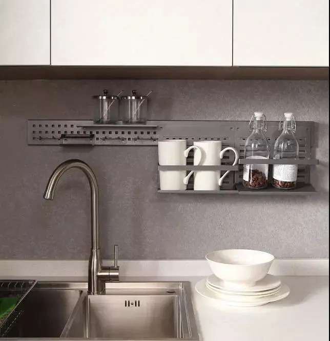 墻上安裝置物架,根據(jù)個(gè)人需求收納,可放置洗好的馬克杯,也可放洗手液和清潔劑。