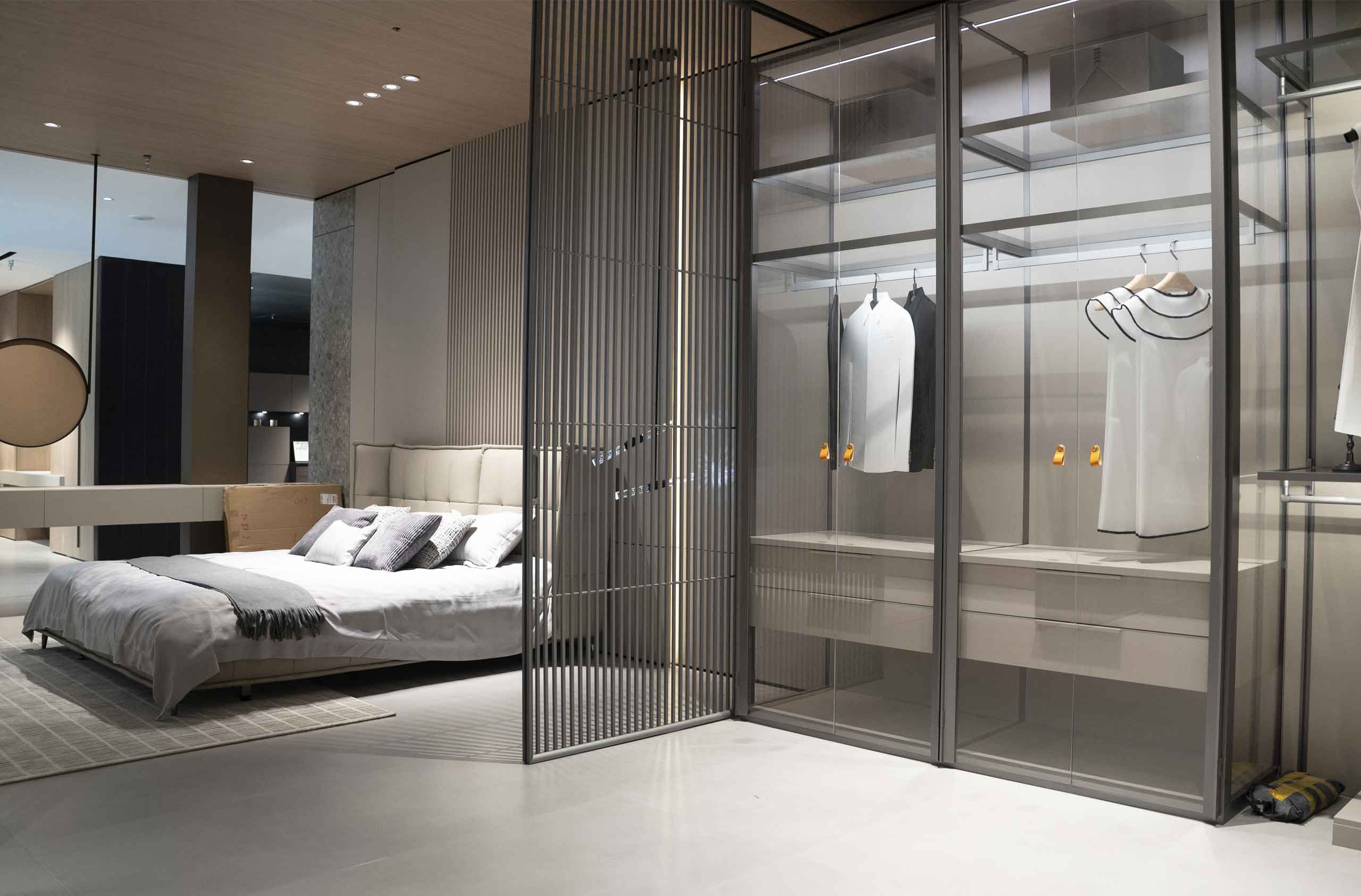 臥室和衣帽間的設(shè)計追求簡潔、優(yōu)雅和純粹,注重接待、洽談、收納和展示功能。一色空間的設(shè)計理念通過頂墻門的一體化呈現(xiàn),與密斯灰墻板相結(jié)合,豐富了立面空間的層次變化。步入式衣帽間和鏤空格柵門展現(xiàn)了優(yōu)雅唯美的特質(zhì)。采用最新的單邊玻璃門和背掛式衣帽間系統(tǒng),打造出輕盈整潔的精致感。這樣的設(shè)計不僅使空間感更大,也體現(xiàn)了簡化產(chǎn)品結(jié)構(gòu)的理念,創(chuàng)造出和諧共存的效果。