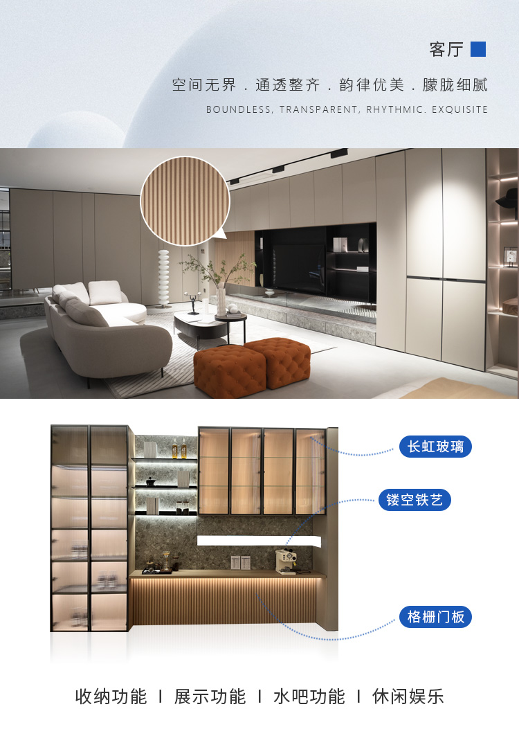 格柵門板和鐳射鏡面的組合將客廳打造成一個(gè)精致而典雅的藝術(shù)殿堂。格柵門板如音符般的排列,營(yíng)造出一種和諧的韻律感,鐳射鏡面則為客廳增添了夢(mèng)幻的氛圍。這里不僅僅是一個(gè)空間,更是一種情感的表達(dá),一個(gè)對(duì)美的追求。