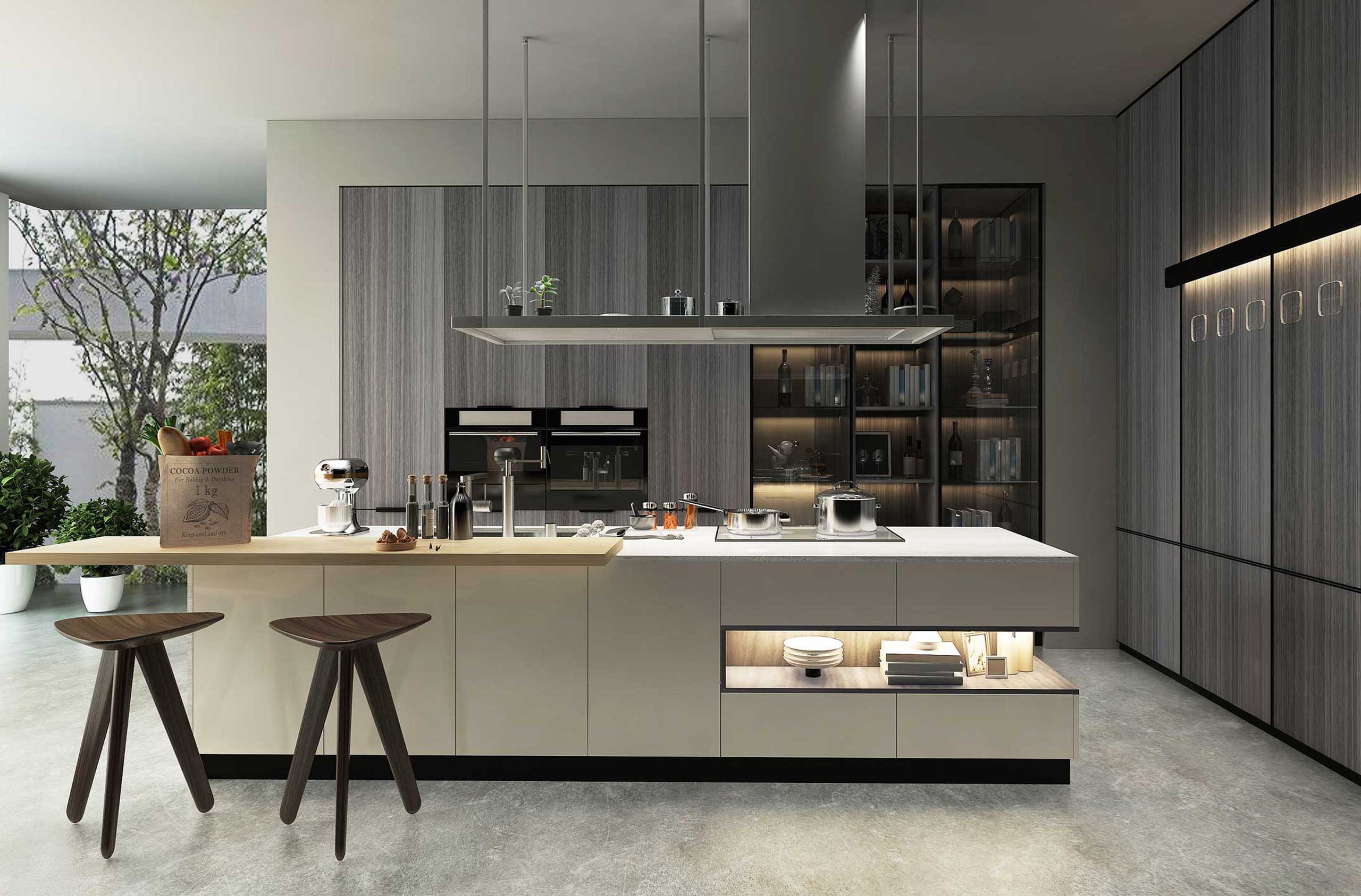 元素:墻柜一體、環(huán)襯柔光、巖板臺(tái)面、極簡(jiǎn)鋁框門(mén)、中島煙機(jī);