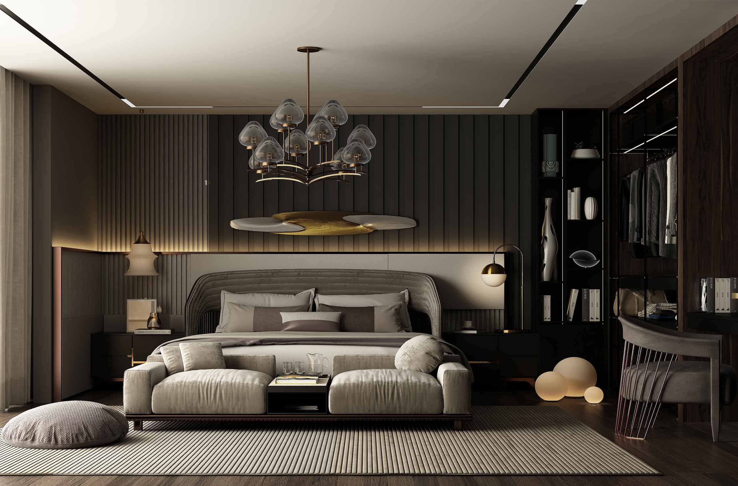 理念:臥室藏著主人的品位和格調(diào),細(xì)節(jié)里彰顯著你的精致與率性;元素:高級(jí)灰調(diào)、護(hù)墻裝飾、合圍設(shè)計(jì)、光影系統(tǒng)、框架衣柜;格調(diào):新潮、簡(jiǎn)約、高雅氣質(zhì)、精致、未來(lái)感、品質(zhì)、國(guó)際范兒;