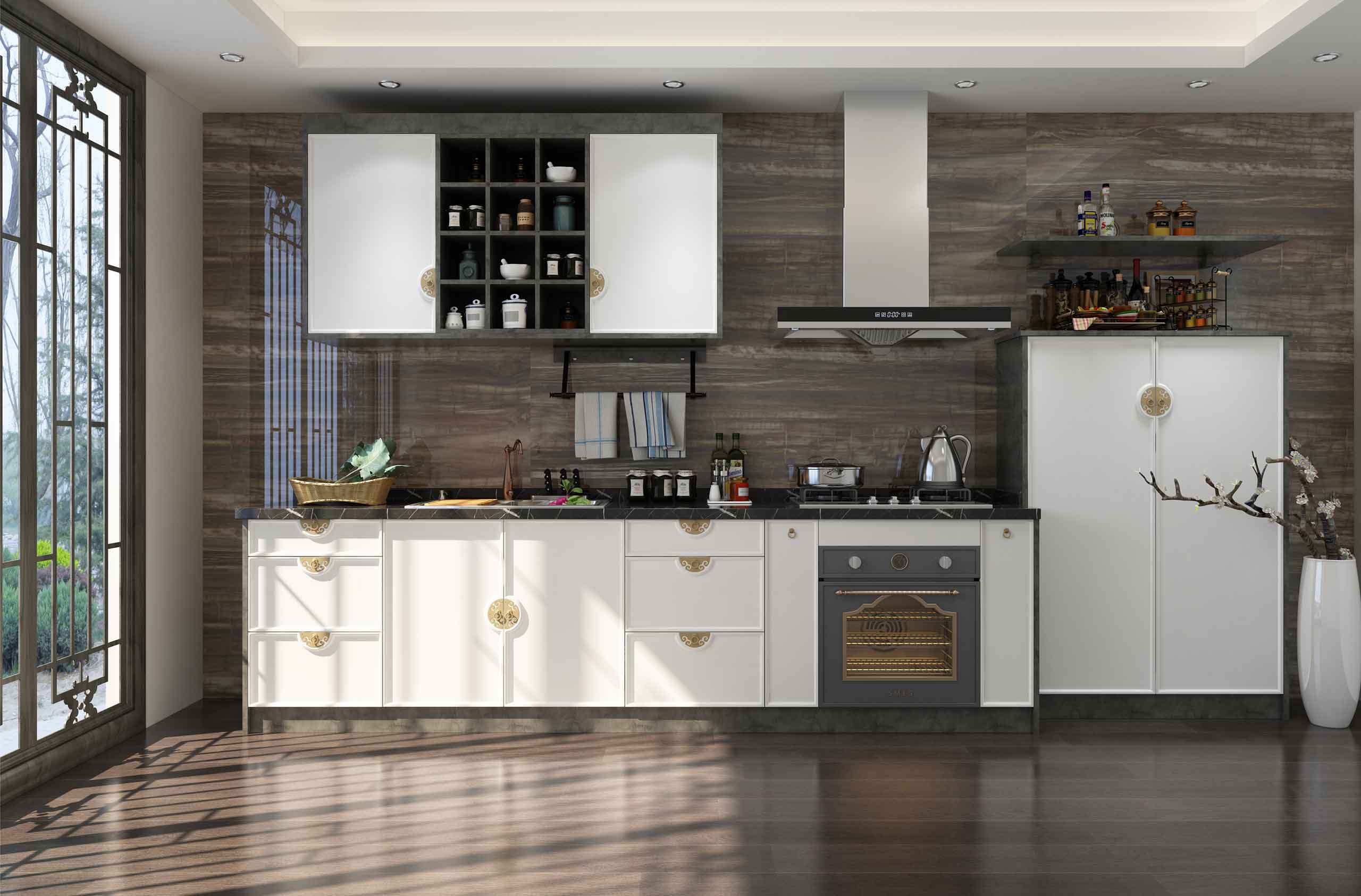 產(chǎn)品宣言:下廚是一場人生修行;設(shè)計理念:新中式講究的是簡約清幽的神韻,穩(wěn)重端莊,靜雅大方;空間元素:儲物柜、開放格、功能五金、全能電器、古銅拉手;