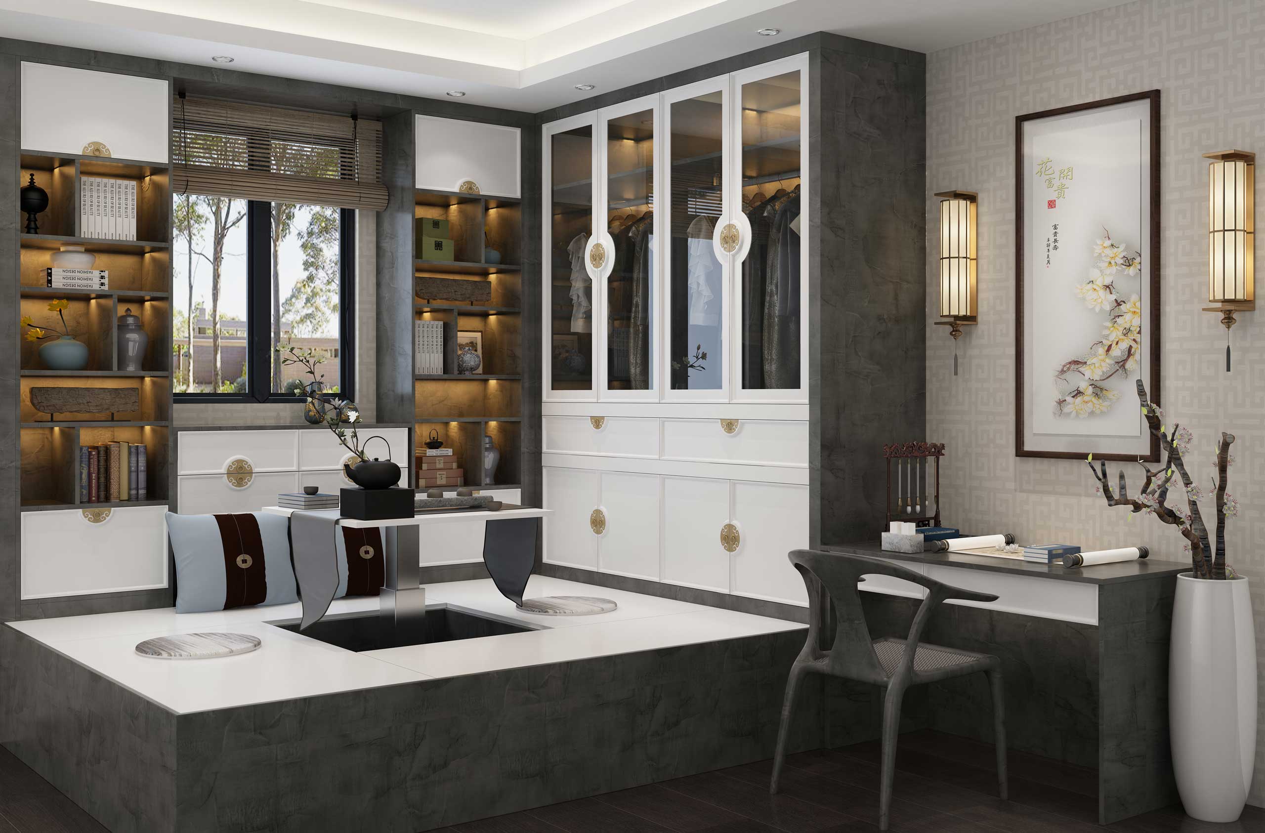 宣言:清凈無礙 妙有圓融;理念:通過意象手法,表達對清雅含蓄、端莊豐華的東方式精神境界的追求;元素:黑白雅調(diào)、展示柜、茶臺、屏風、光影、古銅拉手;